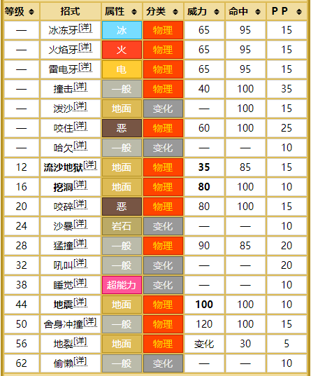 沙之力特性:沙暴天气时,岩石属性、地面属性和钢属性的招式威力会提高。在游戏对战中,在沙暴天气下,该特性的宝可梦不受沙暴伤害,同时使用的岩石属性、钢属性、地面属性招式威力提升30%。