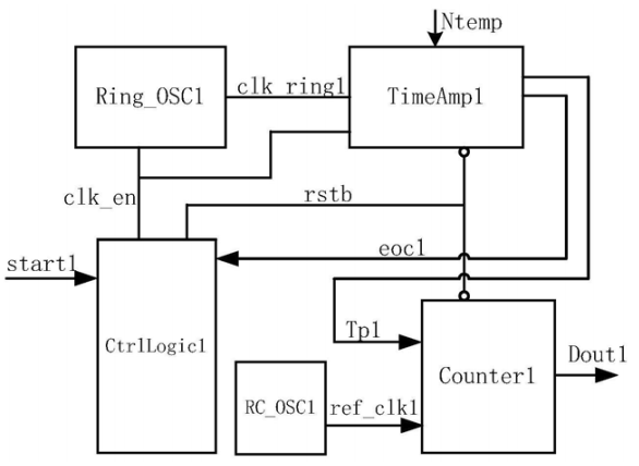如上图,为现有技术中温度传感器的结构示意图,温度传感器(Osc)本质上是一个环形振荡器,它可以产生预定周期Td、Osc的时钟信号,信号通过时间放大器之后被放大成一个脉冲Tp,随后参考时钟REF和计数器计数对脉冲进行测量,从而得到温度的输出。