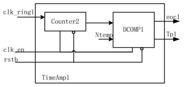 如上图所示为时间放大器的电路图,其主要由计数器和数字比较器DCOMP1组成。当时钟信号为高时,计数器开始计数时钟的个数,并且数字比较器将Tp1置高、eoc1置低;当计数值大于设定的阈值时,数字比较器将Tp1置低、eoc1置高。