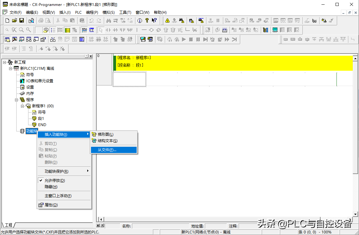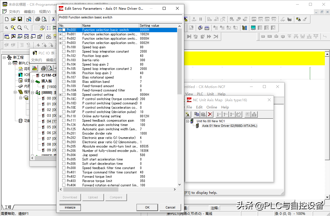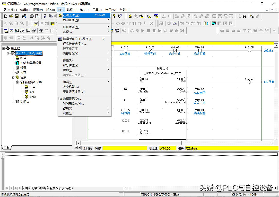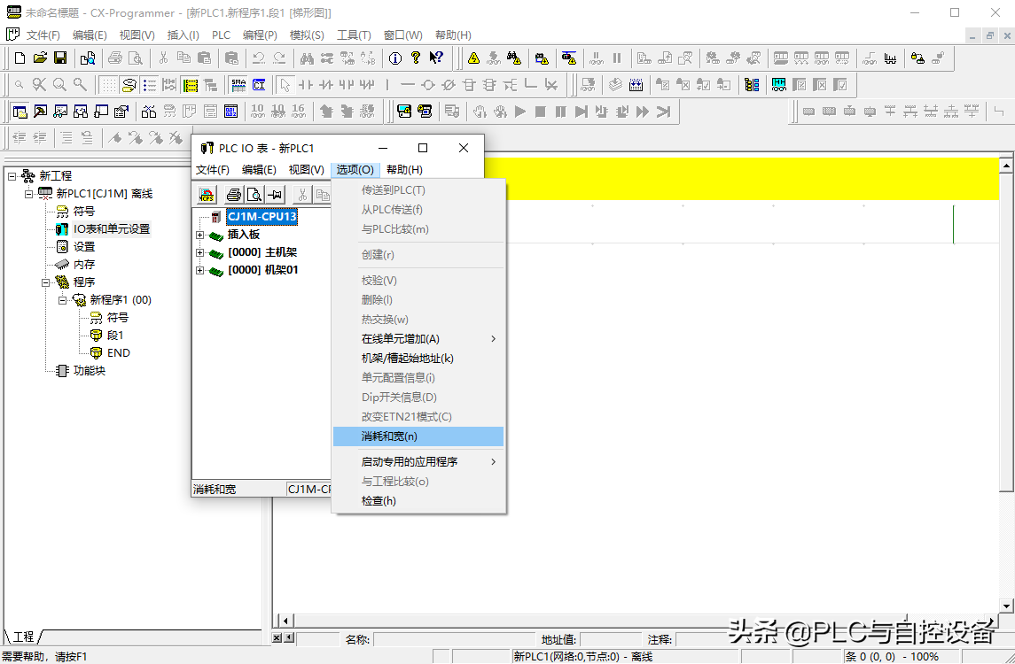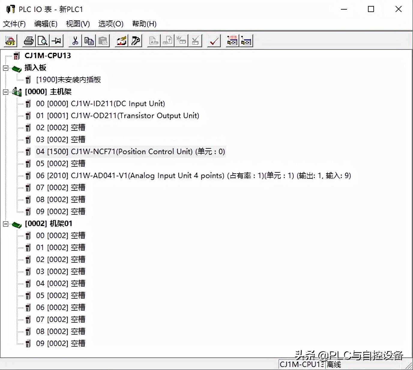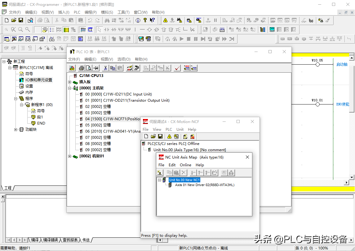第四步,确定I/O地址。如输入模块CJ1W-ID211的字地址是CIO0,输出模块CJ1W-OD211的字地址是CIO1,总线单元CJ1W-NCF71的首字地址是CIO1500,特殊IO单元CJ1W-AD041-V1的首字地址是CIO2010。