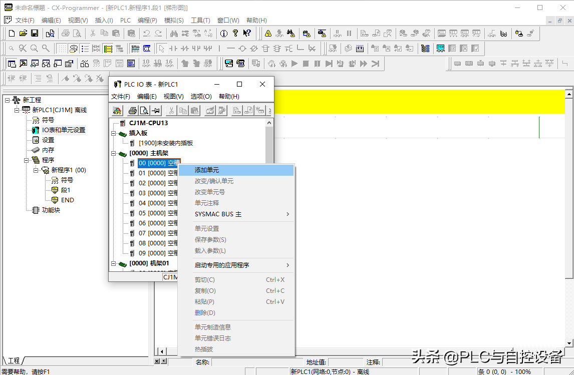 第二步,根据硬件情况配置输入/输出单元。在主机架的第一个(00)空槽位右击鼠标,选择“添加单元”。