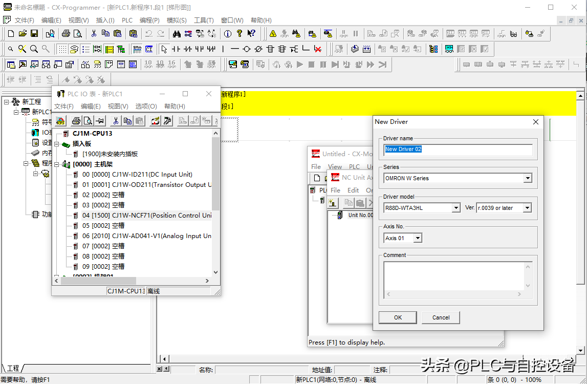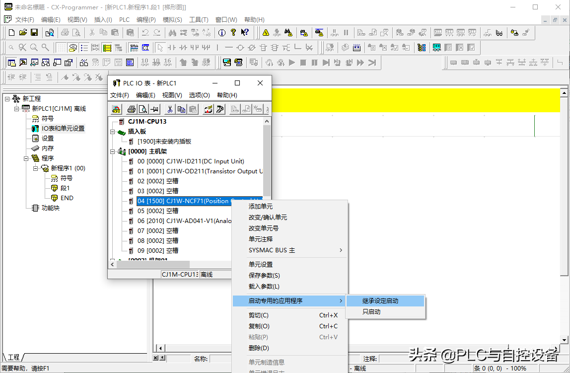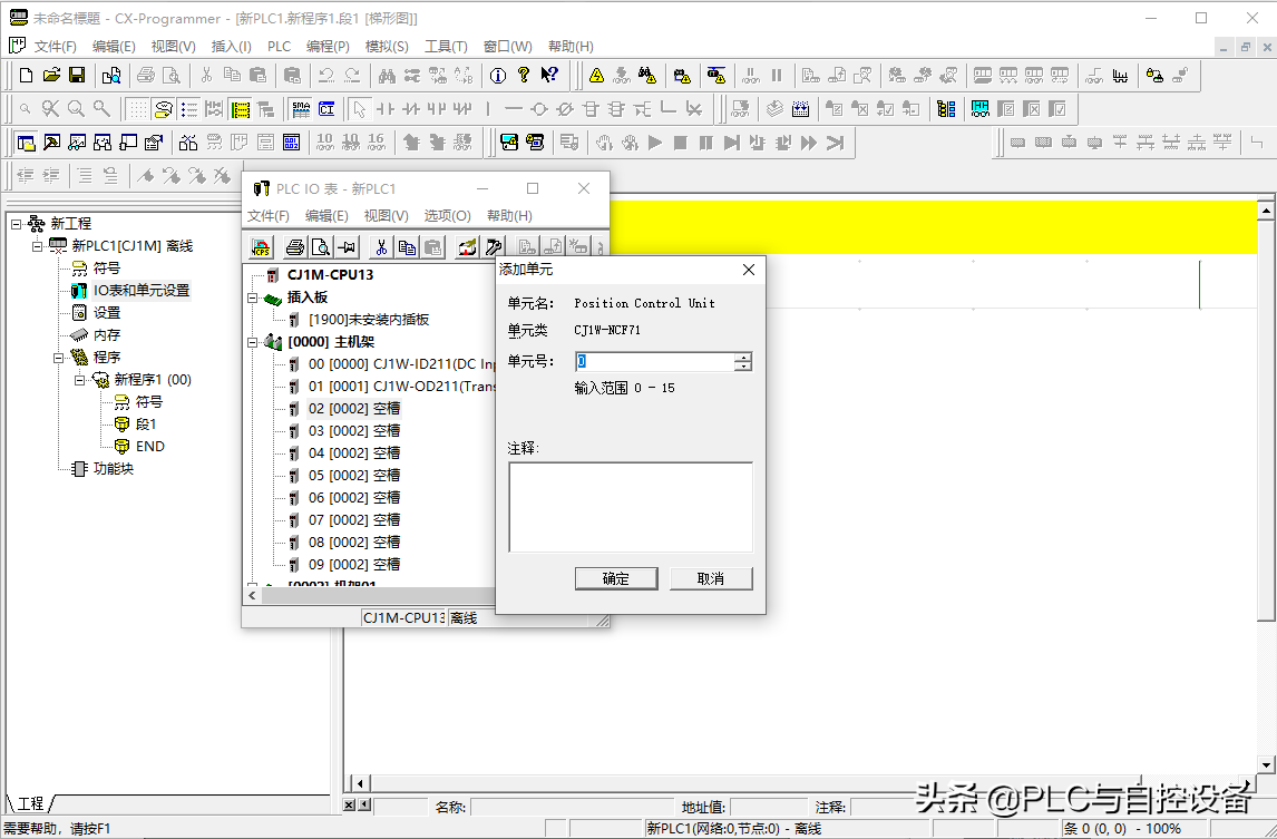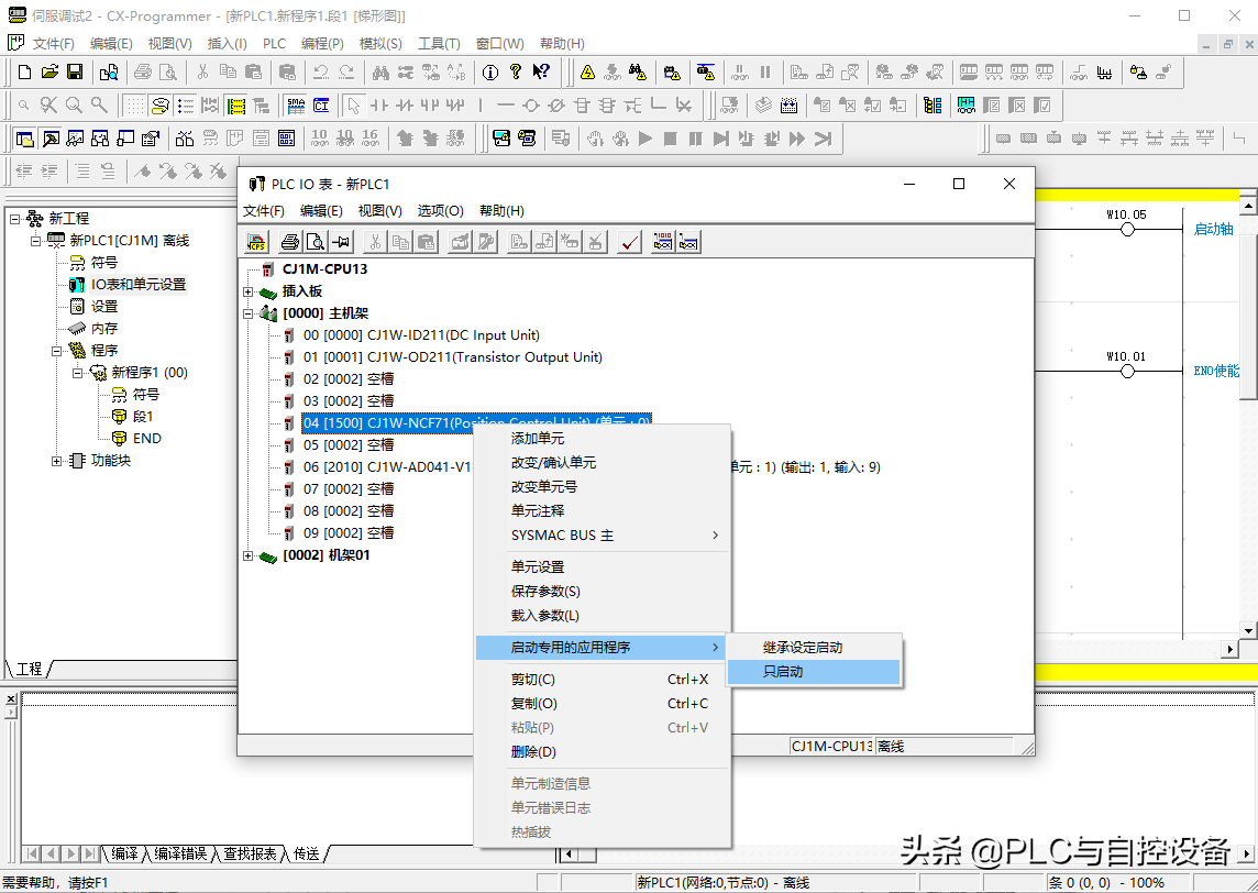 在第五个(04)空槽位中右击鼠标,添加单元,选择“位置控制器”→“CJ1W-NCF71”。特殊I/O单元和总线I/O单元需要设置单元号。这里设置为0号单元(根据实际情况而定)。