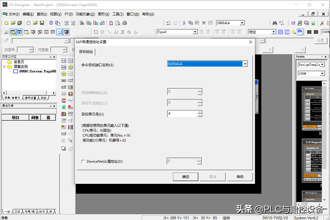 双击该控件,进行通信参数的设置,将目标单元号设定为“4”(根据实际情况而定)。