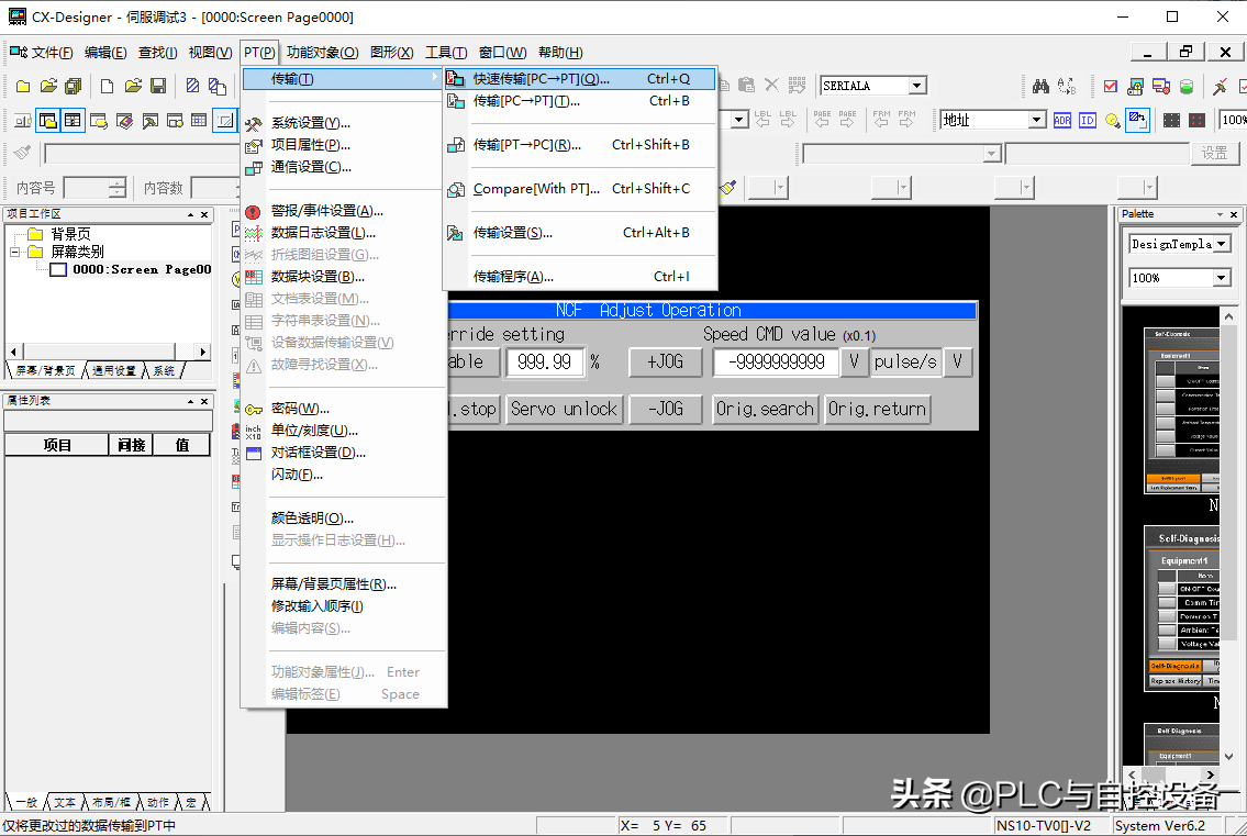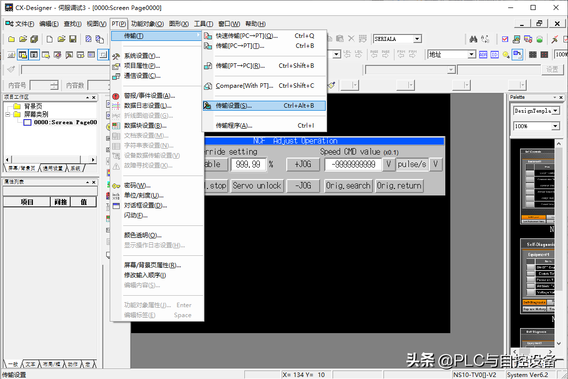 打开CX-Designer欧姆龙NS系列HMI制作软件,打开之前保存的NS文件。选择菜单“PT”→“传输”→“传输设置”→进入传输设置窗口。