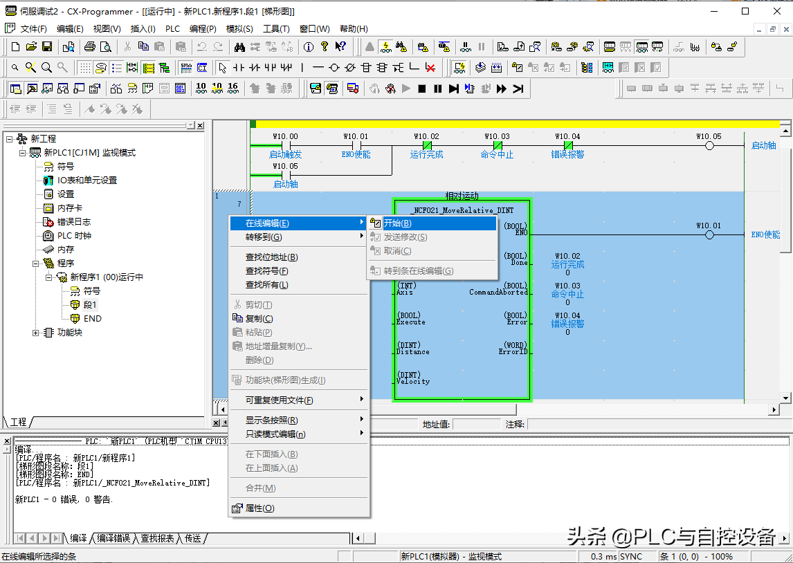 1、在线修改执行条件I/O点。在需要修改的段上右击鼠标,选择“在线编辑”→“开始”,程序段变为可编辑状态。