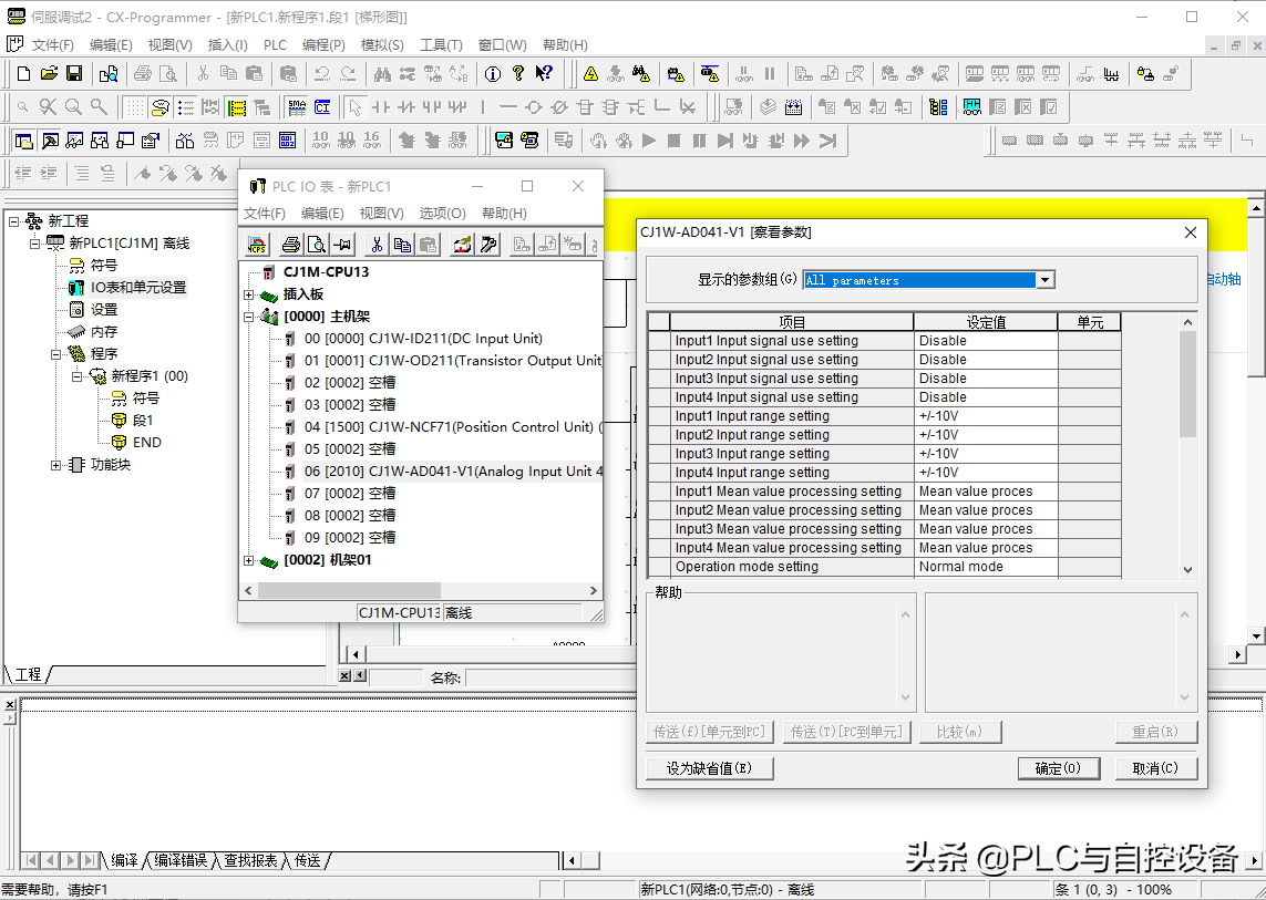 第三步,设定CPU特殊IO单元和总线单元的参数。双击需要设置的单元,如“CJ1W-AD041-V1”单元,打开参数表,可以设置使能、量程等,如下图所示。