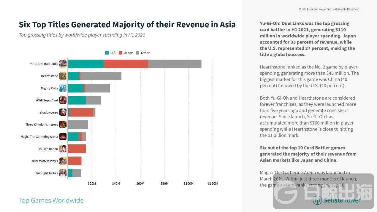 在进入上半年畅销榜前10的卡牌游戏中,有六款的收入都主要来自中国和日本等亚洲市场,而像「游戏王:决斗联盟」与「炉石传说」这样在美国与亚洲市场同时获得大量营收的卡牌游戏则非常少见。SensorTower表示,「万智牌:竞技场」是最有机会在美国和日本市场同时获得成功的卡牌游戏新品。