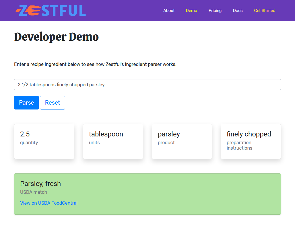 Zestful于2018年中启动,它是我对SaaS业务的第一次尝试。Zestful能让美食app识别出配方成分的结构。当给到像“2又1/2汤匙切碎的欧芹”这样的成分时,Zestful就能推断出数量为2.5,计量单位为汤匙,产品为欧芹,准备步骤为切碎。