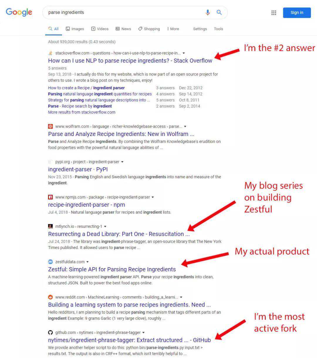 如何把产品出售给一个尚不存在的公司呢?我的策略一直是在SEO上做文章,让Zestful在类似“配方分析”之类的查询中保持一个很靠前的排名。