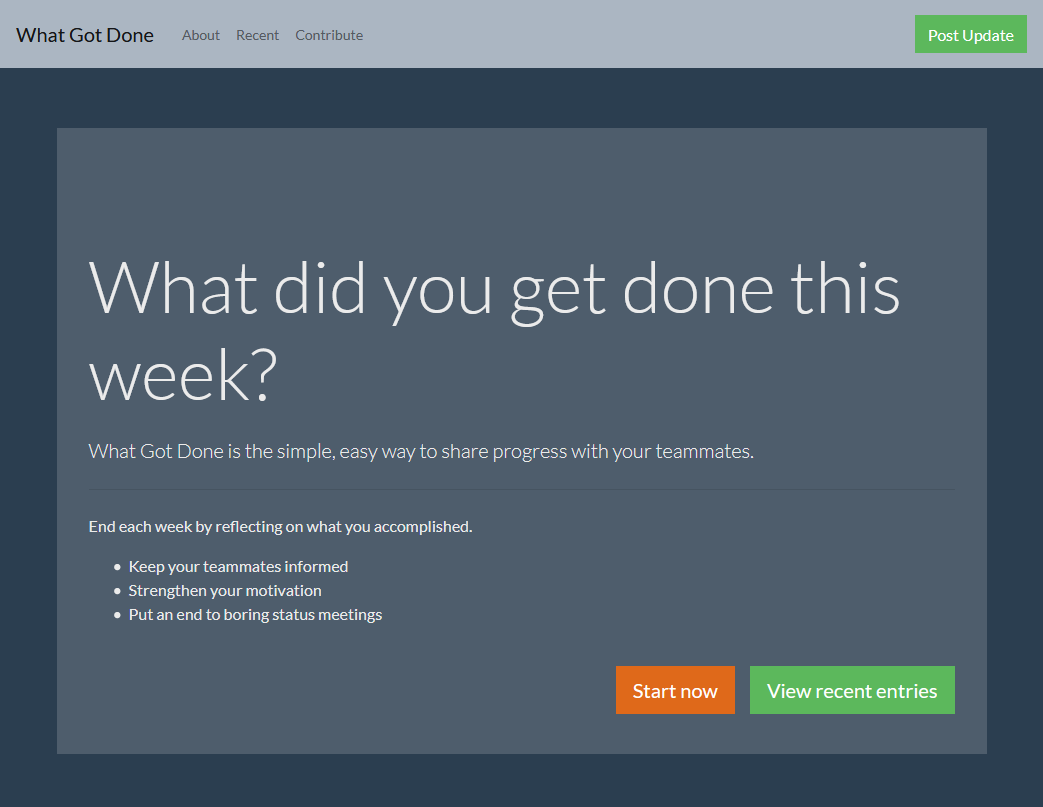 WhatGotDown是一个用来记录和分享每周工作成绩的工具。这是我在Google工作期间学到的一种技巧,并且在过去的10个月中我一直都在用它来记录每周的进度。