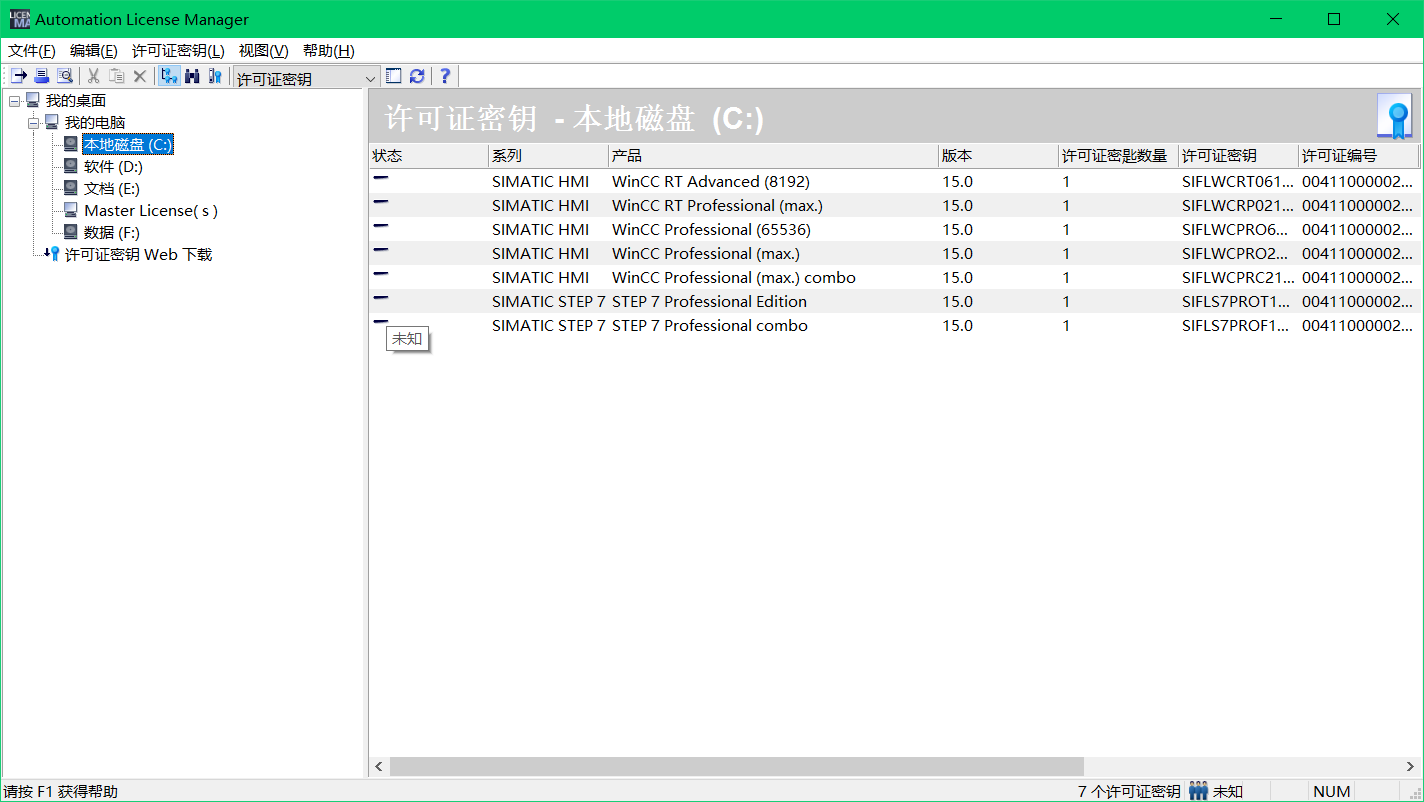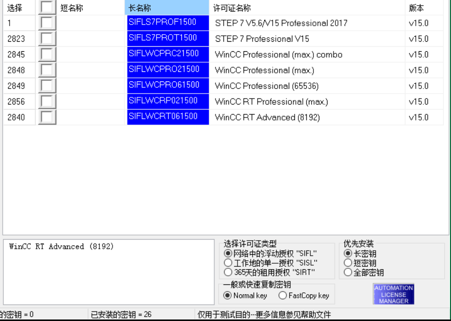在博途组件AutomationLicenseManager中查看密钥是否安装成功。