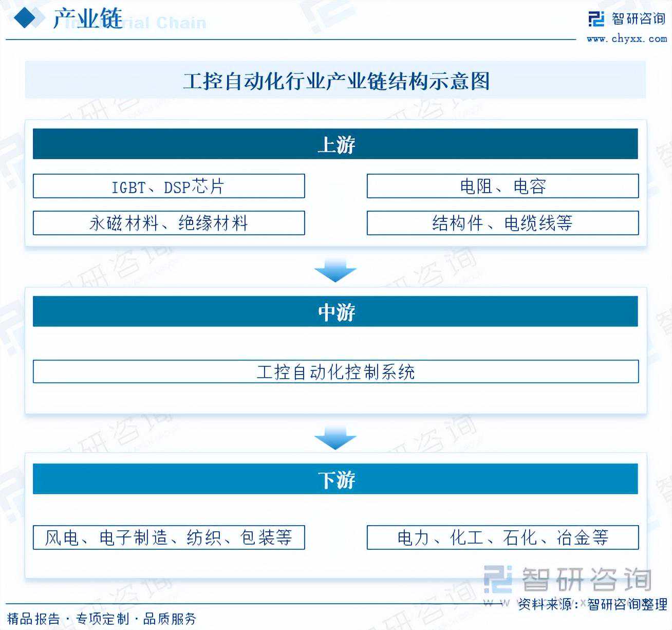 中国工控自动化行业产业链上游为零部件,主要为IGBT、DSP芯片、电阻、电容、永磁材料、绝缘材料、结构件、电缆线等;产业链中游工控自动化控制系统;产业链下游为应用领域,主要为风电、电子制造、纺织、包装、化工、石油等。