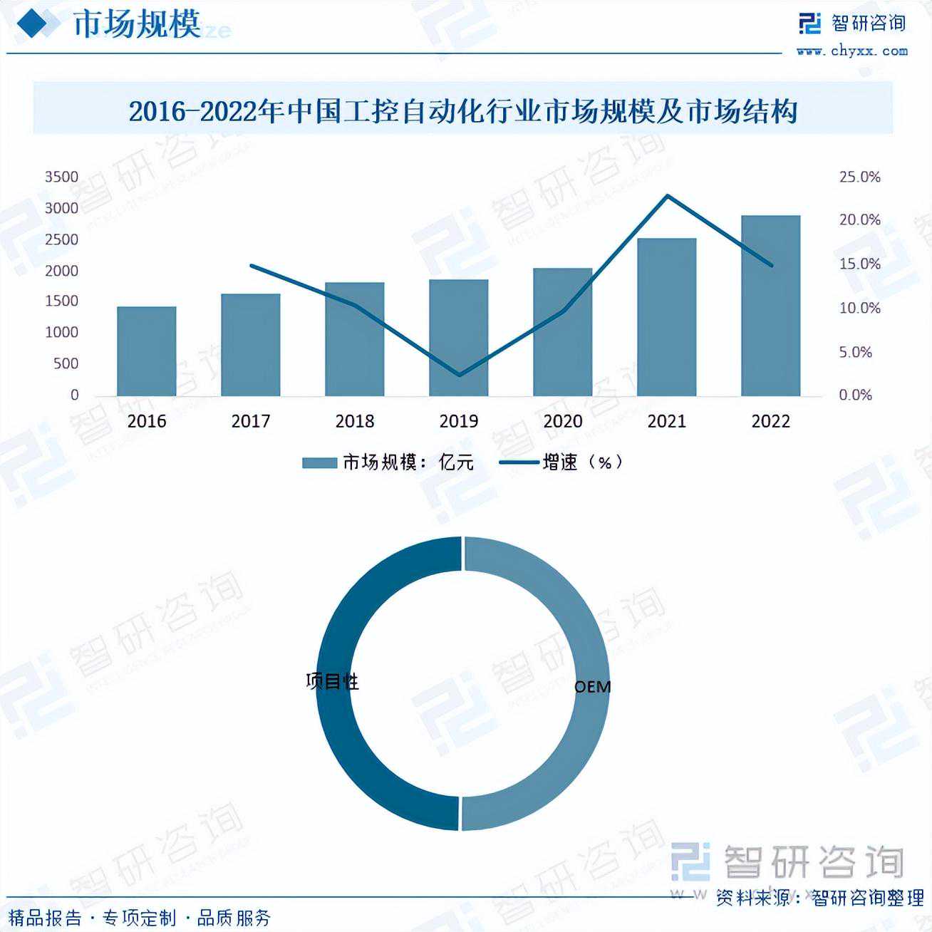 中国工控自动化市场规模庞大,是全球最大的市场之一。中国政府积极支持制造业升级和数字化转型,这推动了工控自动化市场的快速增长。预计中国工控自动化市场将继续增长,尤其是在制造业、能源、交通等领域。工业物联网(IIoT)技术在中国得到广泛应用,帮助企业实现设备互联和数据共享,提高生产效率和质量。人工智能、大数据分析和云计算等新技术被纳入工控自动化解决方案,提供智能化和数据驱动的生产环境。根据数据显示,2022年中国工控自动化行业市场规模约为2909亿元。从市场结构来看,OEM占比最重,占比为50.35%,项目型工控自动化占比为49.65%。