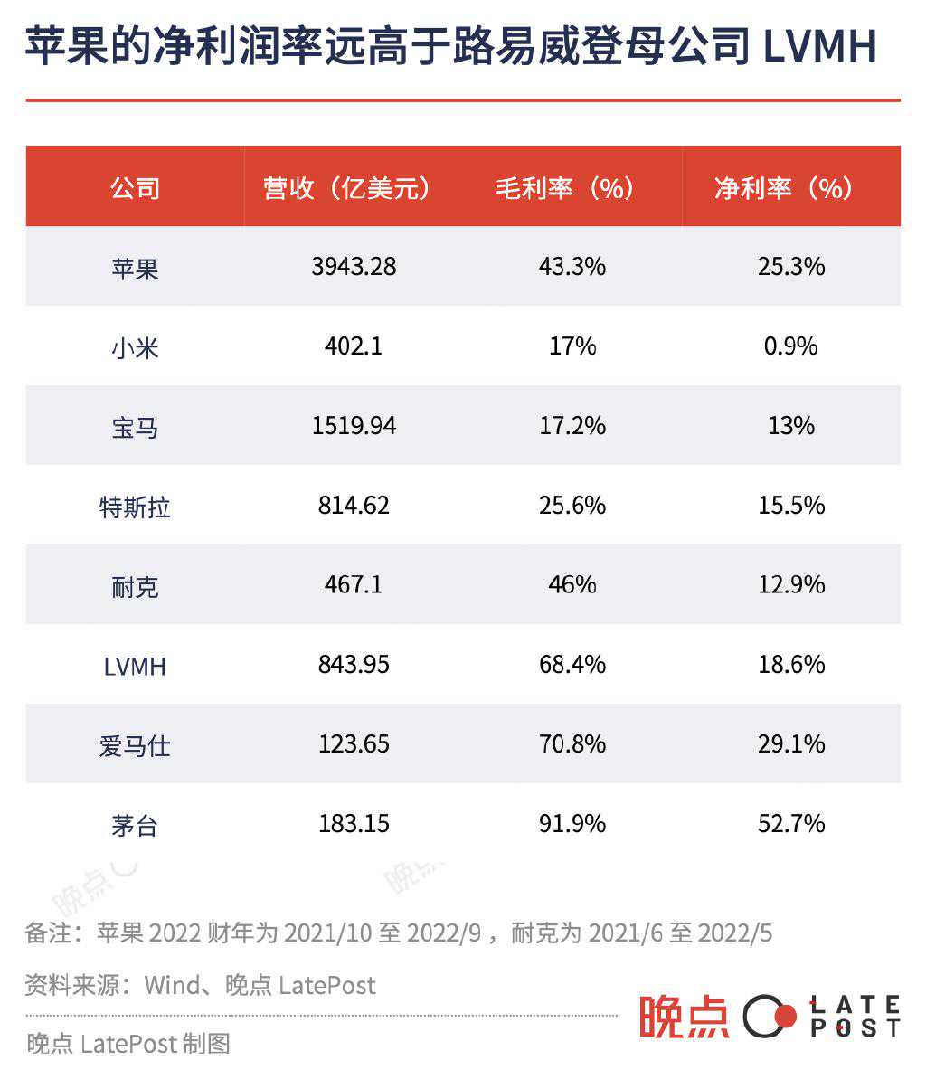 品牌的力量体现在利润率上。苹果最近一个财年的净利润率只是稍低于爱马仕和茅台,远高于路易威登母公司LVMH。苹果的产品定价逼近奢侈品,但过三四年就得换新,于是每年给公司创造上千亿美元利润——全球只有沙特国营石油公司沙特阿美比它更赚钱。