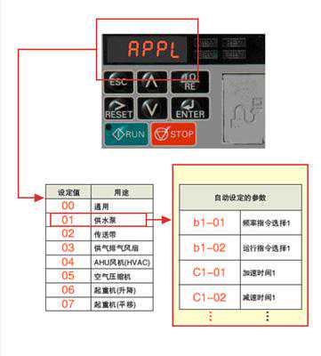 仅需选择给水泵、传送带、供气排气风扇等用途,即可自动设定适宜的参数。缩短了试运行的时间。