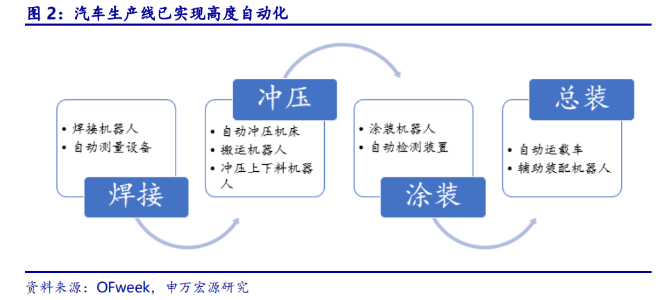 高度自动化:汽车、半导体生产自动化程度高,由不同自动化的工艺流程组成。以汽车工业为例,汽车的生产主要包括冲压、焊接、涂装及总装四大部分流程。当前,汽车生产线已基本实现全自动化生产,工业控制设备及以焊接机器人、喷涂机器人、处理机器人为代表的自动执行设备被广泛应用于汽车生产线各工艺流程,代替人力操作实现高效自动化生产。