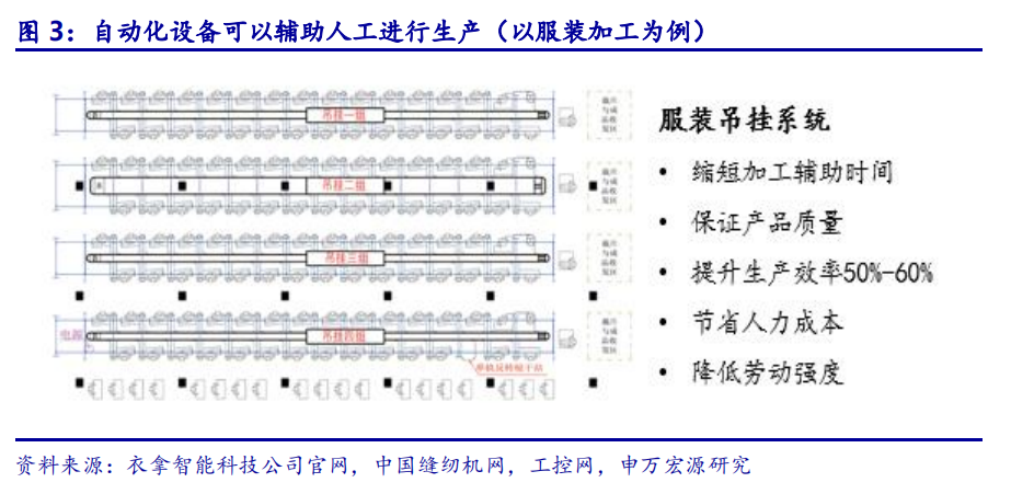 部分自动化:现阶段工厂的主要组织形式,由人与延伸人的能力的设备组成。相比于高度自动化的汽车、半导体产业,3C组装、服装加工等大部分工业生产还处在部分自动化阶段。以服装加工为例,自动开袋机、自动钉扣机、自动拉布机、服装吊挂系统等自动化设备可以辅助人力进行服装生产加工操作,相比于纯手工生产,自动化设备的辅助可以提高生产效率,减少劳动力成本,而未来进一步提升自动化水平是该类企业的必然选择。