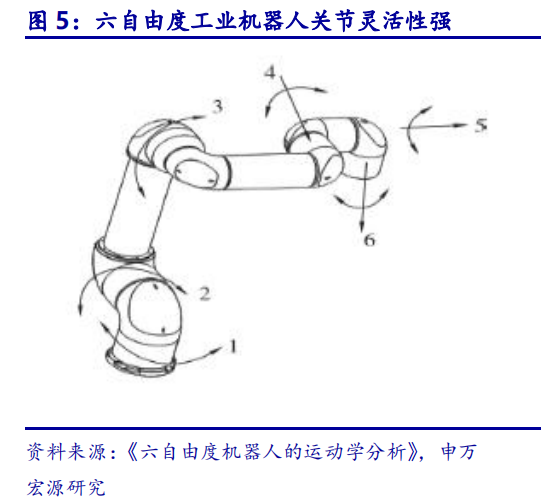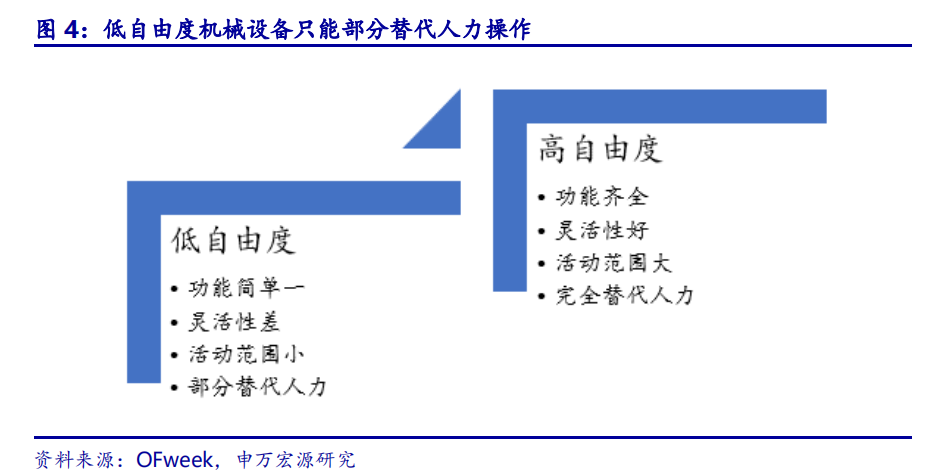 自动化的实现路径是通过机器替代人力动作,低自由度的设备只能部分替代人类动作。在自动化生产中,机器换人的要求是使机器能模仿人的肢体动作进行生产,其中,机器设备的自由度是衡量机器模仿能力的重要指标。人臂有七个自由度,能实现多方向位移及多轴旋转,从而进行复杂的加工操作,而低自由度的机械设备,例如传送带、电动螺丝刀、单轴机械手、叉车等,只能实现单方向位移或旋转,无法完全替代人工,只能作为辅助工具使用。