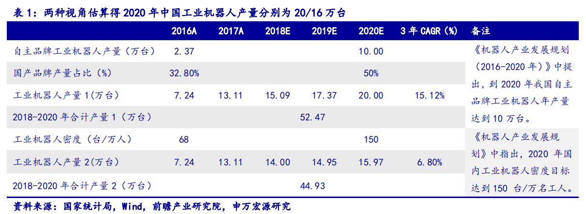 工业机器人本体短期市场空间:政策保底需求爆发,预计2020年国内300亿元。人力成本提升、技术进步带来的成本下降及产业政策的支持是驱动工业机器人市场爆发的三大因素。《机器人产业发展规划(2016-2020年)》中提出,到2020年我国自主品牌工业机器人年产量达到10万台。根据数据显示,2016年我国工业机器人国产品牌产量占比约为32.8%,假设到2020年国产品牌产量占比达到50%,则2020年产量约为20万台。由此我们可以计算出2017-2020年工业机器人产量CAGR为15.12%,测算得2018/2019/2020工业机器人产量分别为15.09/17.37/20.00万台。《机器人产业发展规划》中指出,2020年国内工业机器人密度目标达到150台/万名工人。2016年我国工业机器人密度为68台/万人,根据国家统计局数据显示,2016年我国工业机器人产量约为7.24万台,则根据密度目标估算得2020年产量约为15.97万台,由此计算出2017-2020年工业机器人产量CAGR为6.8%,测算得2018/2019/2020年我国工业机器人产量分别为14.00/14.95/15.97万台。以2018-2020年中国工业机器人产量15/17/20万台为基准,以每台工业机器人15万元均价估算,2020年市场空间达300亿元。