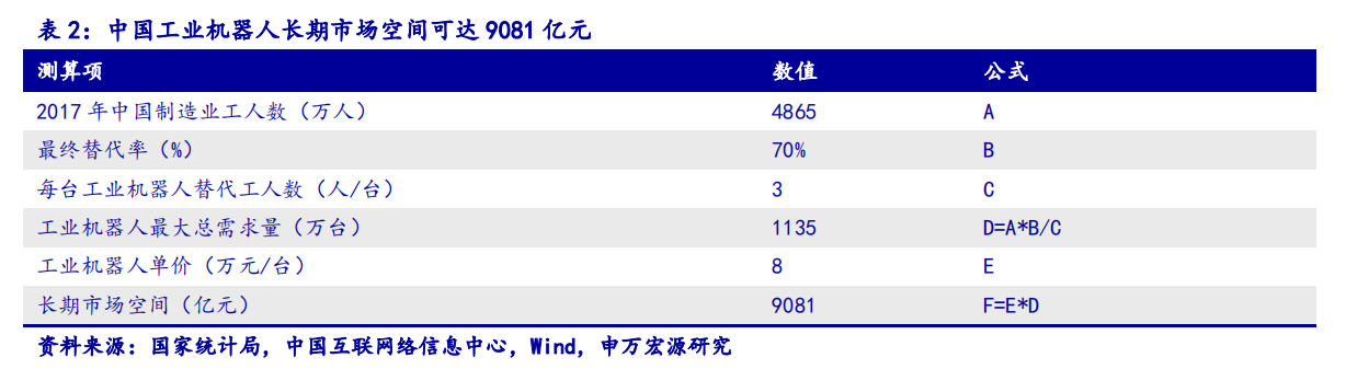 工业机器人本体长期市场空间:替代70%产业工人,市场空间达9000亿元。我们以中国网民职业结构和中国总人口数量估算制造业工人人数,得到2017年底我国共有4865万名制造业工人。我们以70%最终替代率、每台机器人替代3名工人、每台工业机器人价格最终下降到8万元计算,工业机器人本体最终市场需求量为1135万台,市场空间将达9081亿元。