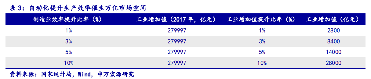 工业自动化提升全要素生产率,以GDP口径估算的市场空间超过万亿。通过对机械设备的自动控制、信息化处理及整体性智能控制等方式,工业自动化可以大幅提升工业企业全要素生产率,对于产业转型升级、工业现代化的建设都有着是很重要的意义。我们以2017年工业增加值为基础,假设提升生产率1%、3%、5%、10%分别估算工业自动化市场空间,由此计算得出当生产率提升10%时,工业自动化设备市场空间可达2.8万亿元。