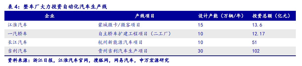 细分领域:汽车自动化产线投资规模大,估计中期仍有万亿空间。当前,国内多家整车厂已加速提升汽车生产线的自动化水平,新建投产的生产线多采用工业机器人、智能化设备与信息化系统,打造自动化、智能化工厂。以长江汽车为例,新建生产线采用ABB、KUKA、安川、雅马哈等国际一线品牌机器人,实现高度智能化生产,已达到高度工业自动化水平。经过统计估算,10万辆/年的产线投资成本在12-50亿元不等,智能制造集成项目价值量高。以我国中长期(15-20年)可以再增加1500万辆汽车产能、置换500万辆产能估计,汽车自动化产线市场空间可达万亿。