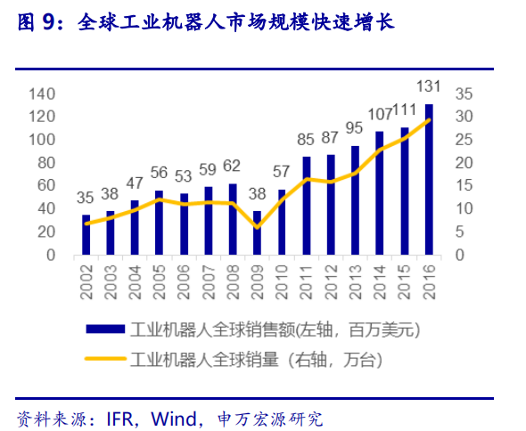 工业机器人是工业自动化的明星产品,300亿本体空间有望撬动万亿自动化改造市场。本体空间余约300亿元:自动化的本质是工艺流程的自动化,最终目标是提高全要素生产率。多轴工业机器人是自动化改造中替代人类劳动及实现部件位移、旋转的核心设备,根据政策与市场需求等因素测算,我们认为2020年我国工业机器人产量将达到20万台左右,市场空间约300亿元。自动化改造万亿市场空间:现阶段汽车行业主机厂可以实现80%以上的自动化生产,甚至可以达到接近100%;电子装配等产线自动化率普遍不足40%,甚至低于10%;我国多数制造业仍处于自动化改造初期,自动化改造空间巨大,以提升全要素生产力视角估算,空间可达万亿量级。