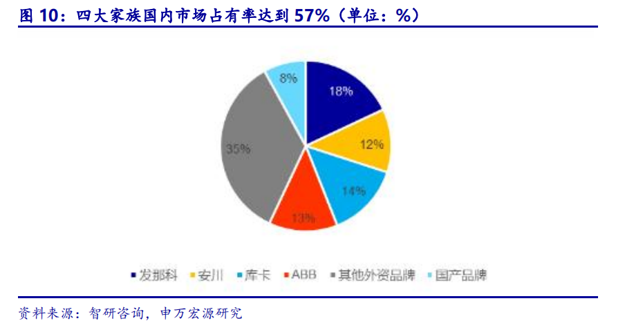 四大家族”战略布局:以本体为先导,作为场景应用的“入场券”。本体市占率高:四大家族作为机器人本体厂商为人认知,2016年在国内市场本体市占率合计达57%,且应用主要集中于汽车整车等高端领域。四大家族机器人产品线各有特色:ABB结合自身强大的本体制造与软件算法能力,收购贝加莱与GE工业系统,在工业自动化、电力自动化等领域不断强化布局;库卡核心零部件自产率低,工业机器人本体核心优势体现在控制端,重点推动工艺集成解决方案业务;发那科数控系统技术领先,工业机器人本体系列多达240种,负重范围从0.5kg至2.3t,通过系统集成整合自身业务板块,实现高质量解决方案输出;安川电机核心零部件优势强大,控制器硬件、电机等优势明显,机器人性价比相对较高,帮助公司不断拓展市场份额。四大家族战略特点总结:以机器人本体为切入点而非主要赢利点,实现向众多领域的自动化改造方案输出,最终目标为自动化改造的庞大市场。