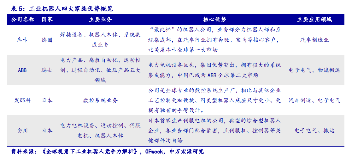 四大家族主业侧重各异,核心技术应用领域各有所长。全球范围内,工业机器人领域第一梯队为德国的库卡(KUKA)、瑞士的ABB、日本的发那科(FANUC)和安川电机(Yaskawa)。四大家族业务侧重点不同,库卡业务主要集中在机器人本体和系统集成,广泛应用于汽车领域,拥有奔驰、宝马等核心客户。ABB专注于电力电机与运动控制,应用于电子电气与物流搬运业,也广泛应用在高度成熟的汽车生产线中。发那科数控系统技术全球领先,相较其他企业工艺控制更加高效便捷。安川主要集中于伺服电机与运动控制器领域,是日本首家制造伺服电机的公司。