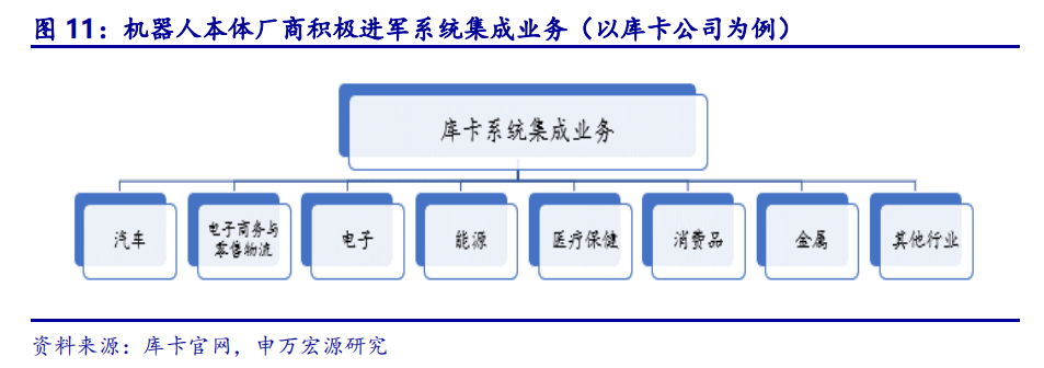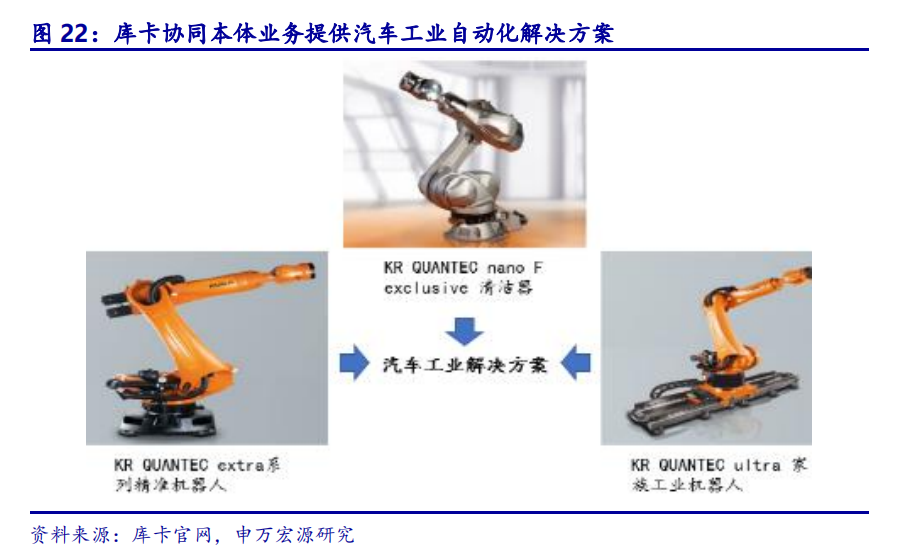 机器人本体与系统集成协同应用,搭建完整生产线。库卡作为机器人本体巨头,将系统集成业务与机器人本体紧密联系,两者产生协同效应,为客户提供一站式生产、物流和组件供应。以汽车工业为例,为能理想地满足汽车行业的各种要求,库卡的产品组合包括KRQUANTECnanoFexclusive清洁机器人、KRQUANTECextra系列的精准机器人及KRQUANTECultra家族的强大工业机器人。
