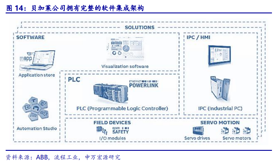 贝加莱优势二:产品线完整,工业软件行业领先。贝加莱公司拥有完整的产品线全方位支持自动化行业的配套应用,其应用产品线有:控制系统、显示系统、I/O系统、工业PC、运动控制、过程控制、现场总线和自动化软件。全系列产品广泛应用于机械自动化和过程自动化领域。特别是在工业软件方面,公司是PLC、工业PC机、伺服系统控制的真正领导者,拥有完整的集成架构,软件及通信能力都处于领先地位。