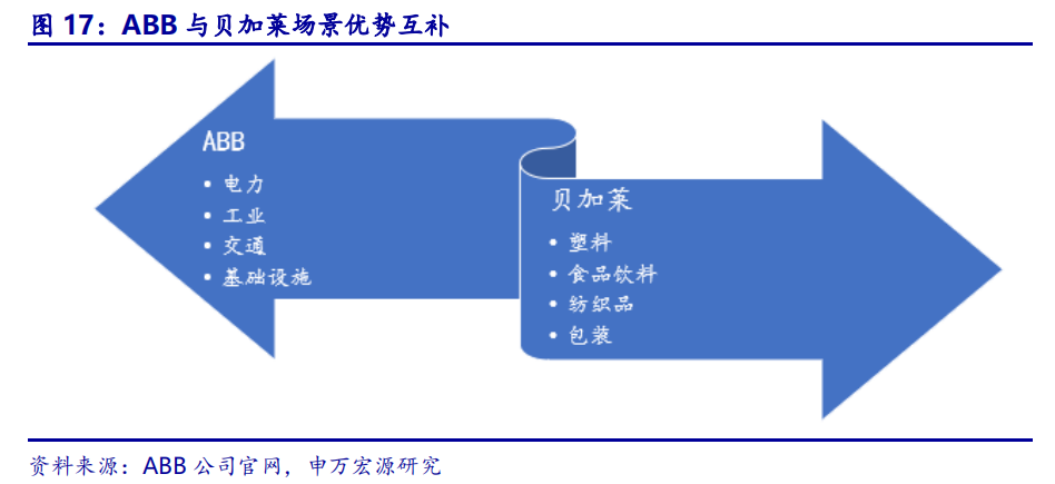 双方场景优势互补,ABB加快完善系统集成下游版图布局。ABB作为拥有126年历史的全球工业自动化领导企业,在电力、工业、交通和基础设施等行业具有深厚的积淀,公司长期为该类领域提供系统集成服务。而贝加莱凭借其行业领先的软件和服务在离散制造业优势明显,可以为塑料、食品饮料、纺织品和包装等行业提供业内领先的解决方案,这对于ABB的系统集成业务布局是一个理想的补充。