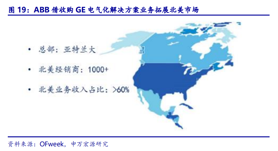 凭借GE渠道优势,ABB借机拓展北美市场。GE电气化解决方案业务遍及全球100多个国家,并在ABB全球第一大市场的北美市场拥有庞大的装机量。该业务总部位于美国佐治亚州的亚特兰大,在全球拥有约1.35万名员工,2016年销售收入约为27亿美元。凭借GE深厚的客户关系、庞大的装机量和覆盖广泛的销售渠道,ABB有望进一步拓展北美市场。