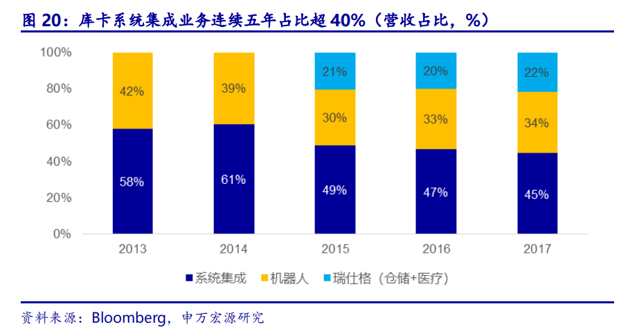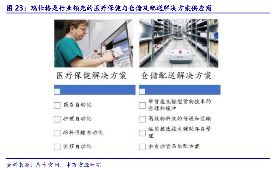 库卡收购瑞仕格,加码医疗、仓储系统集成领域。瑞仕格公司(Swisslog)为医院、仓库和配送中心实施先进的自动化解决方案,始终处于行业领先地位。2015年库卡收购瑞仕格,产生高质量协同效应促进公司医疗、物流自动化业务的技术提升。瑞仕格医疗解决方案致力于通过药店、护理、物料运输、流程的自动化减少员工在材料和药品供应中的常规工作,降低发生错误的概率。瑞仕格同时为物料流的传送、带货盘及轻型货物技术的仓储、拣选技术和库存管理、货品组配提供自动化解决方案。