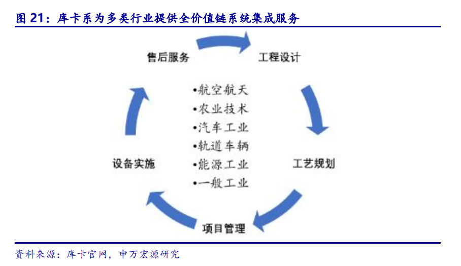 库卡集成服务覆盖设备全价值链,为多种行业提供解决方案。库卡作为全球领先的系统集成商一向以面向客户、技术领先和提供最佳解决方案而著称。公司为客户实施自动化系统并承接现有设施的改造,同时提供全面的售后服务以及工艺规划或同步工程设计,为航空航天、汽车工业、能源、农业等各个行业的客户提供整套自动化解决方案。
