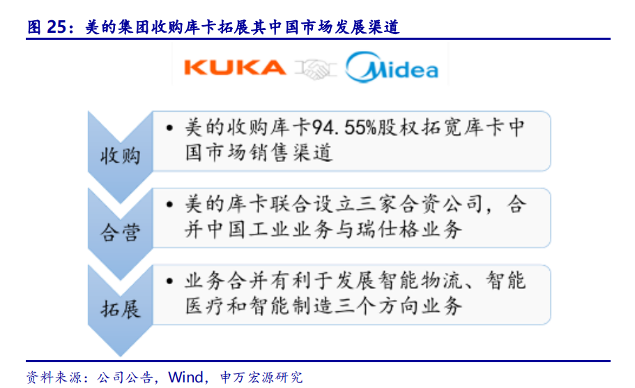 美的收购库卡94.55%股权,联合开展中国业务。2016年6月15日,德国联邦金融监管局审核通过了美的集团股份有限公司要约收购库卡的收购文件,美的成功完成对库卡的94.55%股本要约收购。美的收购库卡,为库卡提供了全新的中国市场的拓展渠道,库卡将充分受益于中国工业机器人需求的强劲增长。2018年3月,美的宣布库卡将在中国的一般工业业务与瑞仕格子公司中国业务合并,并与美的集团设立合资公司承接上述业务。该合资子公司的设立将进一步推动库卡中国市场在智能制造、智能医疗和智能物流方面的高速发展。
