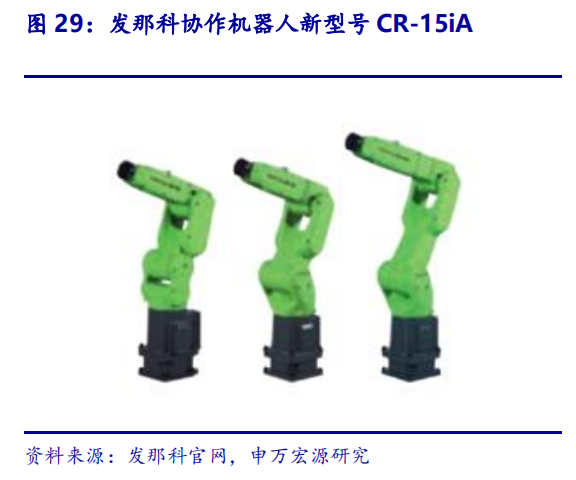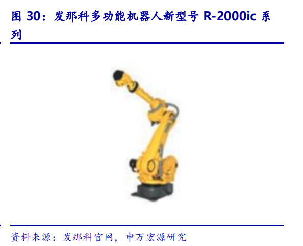 R-2000ic系列机器人适用多场景,协作机器人促进人机合作。2017年发那科进一步研发迭代了多功能智能机器人R-2000ic系列与协作机器人。R-2000ic系列机器人凝聚发那科多年技术经验,实现机器人机构轻量化、苗条化,最大手腕负重达220kg,基座可搬运质量达550kg,负重量高于行业平均水平,可应用于大量生产场景,尤其适用于汽车整车及零部件的点焊作业。协作机器人CR-15iA等型号机器人可免去原有设备操作安全防护装置,更好实现人机协作。