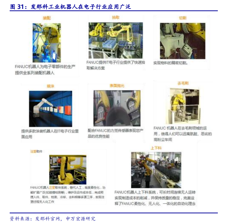 发那科机器人精度高,广泛应用于电子行业。发那科机器人在电子行业中有大量应用,发那科小型机器人擅长小工件装配,可用于安装计算机硬盘、磨削光学透镜或组装燃料电池。中型机器人配套控制系统,可实现高品质研磨抛光和去毛刺飞边,可用于零部件精加工。发那科同时是全电动注塑机领导企业,拥有多项注塑技术,可用于手机精密件、生物医疗器械制品的加工。