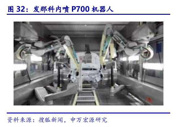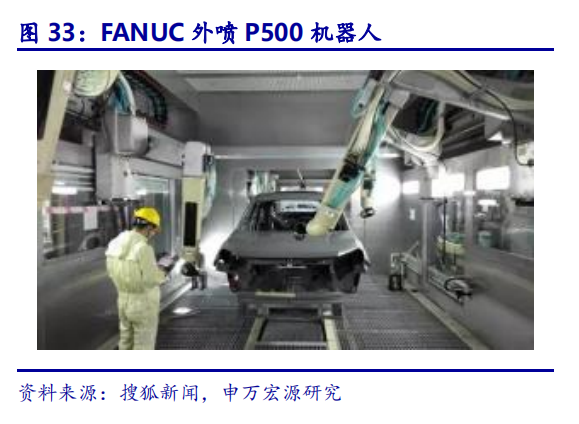 发那科系统集成技术领先,为整车行业提供智能柔性解决方案。发那科基于机器人本体产品与数控技术,发展系统集成业务,广泛应用于下游各行业。发那科为全世界知名汽车制造商及零部件供应商提供全方位的解决方案,为大量汽车企业实现了冲压、焊接、涂胶、激光检测、喷涂等多项功能,是通用全球唯一指定机器人供应商,日产公司唯一焊装车间供应商,是本田、大众两家机器人供应商之一。发那科为长安汽车提供全自动喷涂产线,实现内口喷涂质量30%提升、涂料利用率40%的提升。