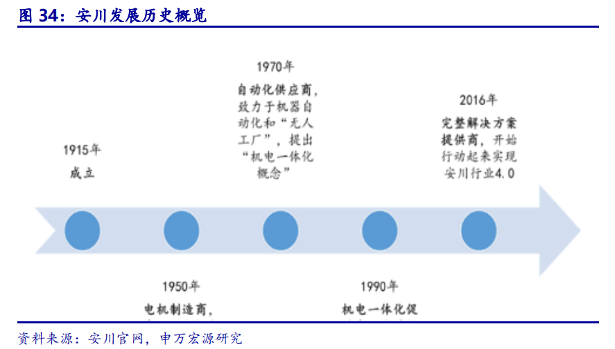 电机制造商起家,创新发展成完整解决方案提供商。安川成立于1915年,早期将自身定义为电机及其应用提供商,是全日本首家制造伺服电机的企业。20世纪60年代,安川首次提出了“机电一体化”的概念,并基于此理念持续推出控制器、机器人本体、功率转换器等核心产品,随着“机电一体化”概念在全球的逐步推广,安川的技术与理念成为行业标杆。经过100多年的发展,安川已逐步发展成为自动化完整解决方案的提供商。