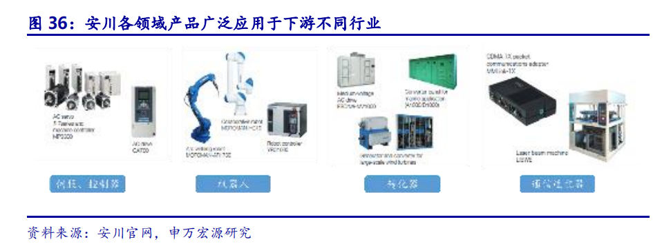 四大领域应用不同下游,提供完整自动化解决方案。安川生产AC伺服、控制器以满足下游厂商对核心零部件的需求。同时生产焊接、喷涂、组装等不同功能机器人,主要应用于工业自动化相关的下游领域,如焊接、喷涂、组装机器人在汽车行业的应用,清洁、转移机器人在半导体与LCD液晶面板制造行业的应用。安川的系统工程主要针对大型的钢厂、社会公用事业、环保及能源行业提供电气产品。除上述主要应用外,安川的产品还有其他诸如信息、物流服务等行业的应用。