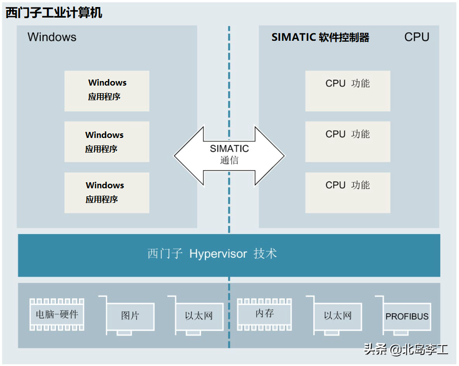 S7-1500软件控制器(软PLC)必须安装到西门子的工业计算机上,它是一套运行在Windows系统上的软件产品。准确来说,S7-1500软件控制器采用Hypervisor技术,将工业计算机的资源分成两部分,一部分用于运行Windows系统及其程序;另一部分用于运行软PLC。两者之间保留SIMATIC通信功能,但Windows系统及其程序无权访问软PLC的资源。如下图所示: