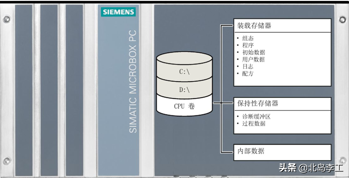 对于存储器来说,S7-1500软件控制器会在工业计算机上创建一个专用的卷,并将装载存储器和保持存储器集成在该卷上;使用计算机的部分内存作为工作存储器,如下图所示: