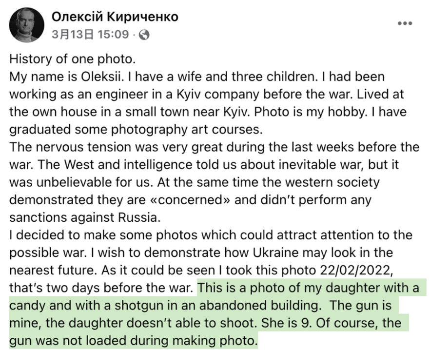 3月13日,也就是这张照片被病毒式传播的2天后,基里琴科正式在脸书上对照片拍摄的背景和契机做出回应。他表示,以上系列照片拍摄于2月22日,也就是普京宣布“特别军事行动”前两天。其时,乌克兰社会对战争的恐惧已经弥漫开来。基里琴科希望通过拍摄女孩、糖果和步枪这样的组合,“展示乌克兰在不远的将来会变成什么样子。”“这是我女儿在一栋废弃的建筑里拿着糖果和猎枪的照片。枪是我的,女儿不会射击。当然,拍摄时枪没有装子弹。”