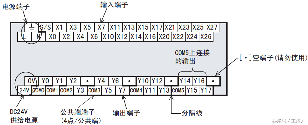 以40端子来说明,输入3组+输出2组=5*40端子,其中输入端子只有一个公共端S/S,而输出有5个公共端。Y0和Y1各单独使用com端,Y2和Y3共用con2,Y4、5、6、7共用com3,Y10、11、12、13共用com4,Y14、15、16、17共用com5。