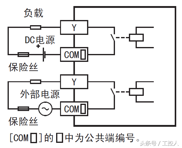 总体来说,PLC输出信号的接法简单,可以理解PLC的输出就是线圈的两个触点Y和com端,这两个触点接负载的两端即可,我们只要了解PLC的输出类型与负载类型看是否需要通过中继来驱动。