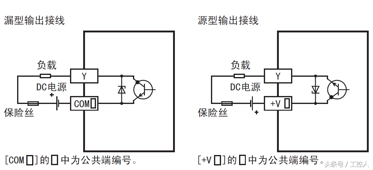 晶体管类型的PLC的外部电源必须是直流的,有漏型接法、源型接法与输入的说法刚好相反: