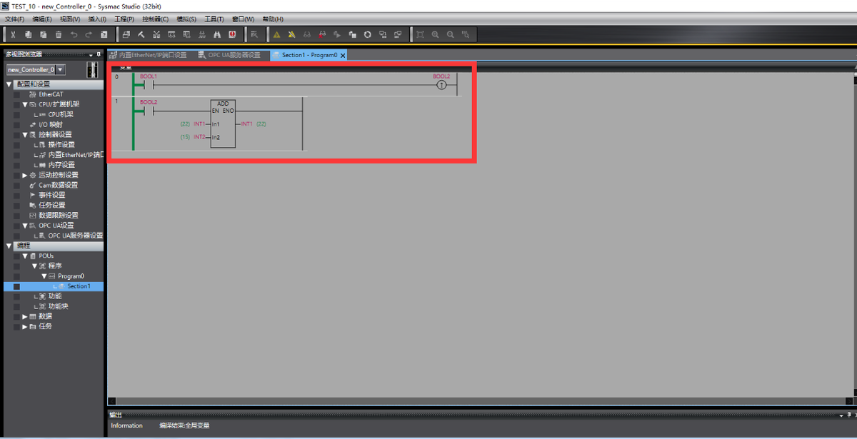 编写PLC测试程序,在线下载并对标签点赋值,INT1变量当前值为22