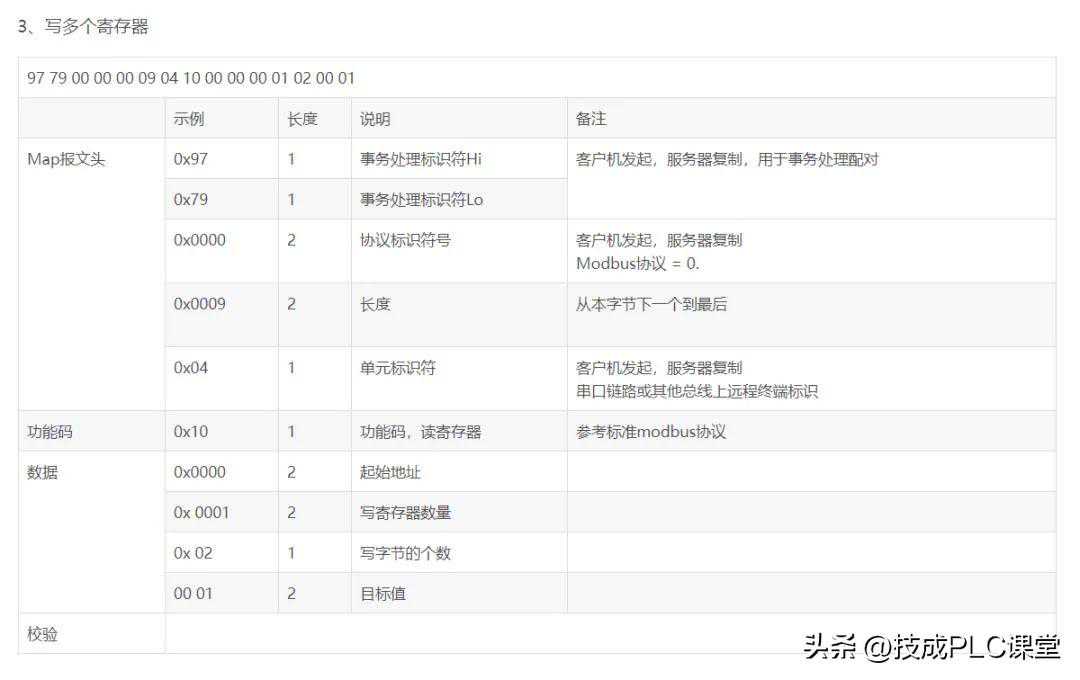 请求:MBAP功能码起始地址H起始地址L寄存器数量H寄存器数量L字节长度寄存器值(13+寄存器数量×2)