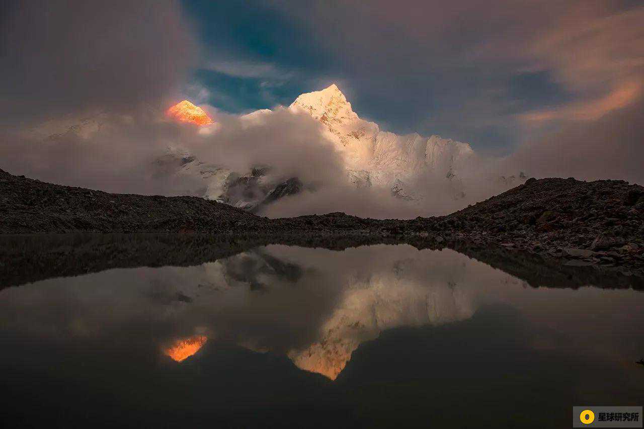 (PumoriBC边上的小池塘倒映出了双峰,左为珠峰,右为努子峰,摄影师@曲子华)
